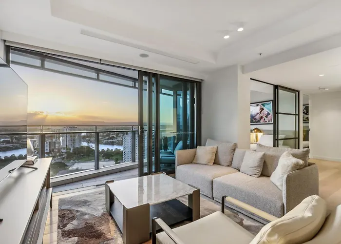 Das Apartment Jewel Luxury Beachside 2-Bed With Water View Gym Gold Coast liegt etwa 6 Gehminuten von den Cascade Gardens entfernt und begrüßt seine Gäste mit einer Sauna. Die Apartments liegt im Viertel Surfers' Paradise von Gold Coast und bietet eine Sonnenterrasse und Blick auf die Stadt.
